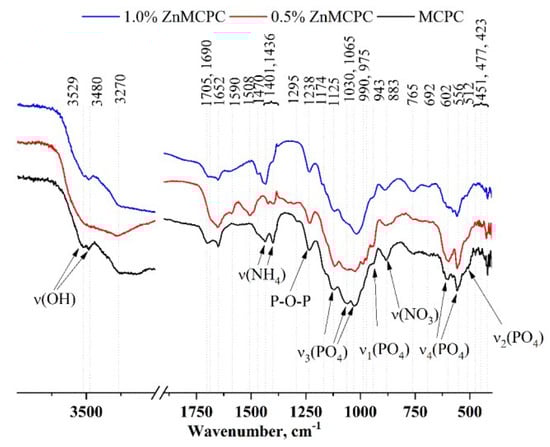Based on the XRD data unit cell parameters, the cell volumes were calculated for MCPC and Zn2+-doped MCPC struvite and newberyite phases. The amount of struvite volume cell of the MCPC is 0.485 nm3, 0.5 wt% Zn is 0.479 nm3, and 1.0 wt% Zn is 0.478 nm3. It could be concluded that doping with Zn2+ leads to a decrease in cell volume of struvite phase. These data were obtained for the first time for MCPCs. In addition, newberyite cell volumes were determined for Zn2+-doped materials; it was found that the introduction of 1.0 wt% Zn2+ led to a decrease in cell volume from 1.096 nm3 to 1.099 nm3 for 0.5 wt% Zn2+. This relation could be explained by assuming cell distortion due to the differences in ionic radii of Zn2+ and Mg2+.
