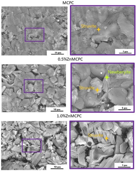 The microstructure of the set cement samples was investigated, and it indicated the formation of new cementing phases on the surface (Figure 5). The MCPC sample is characterized by a dense poreless structure of the struvite phase. The introduction of Zn2+ ions led to a struvite crystal shape modification. The crystalline phase has geometric features, such as a honeycomb appearance with an average crystalline size of approximately 5–8 μm for 0.5%Zn-MCPC. On the surface of the Zn2+-doped cement samples, the emergence of the new cementing crystalline hydrate phase newberyite was registered. On the surface of the sample’s cracks, we noticed the newberyite phase in the BSE mode.