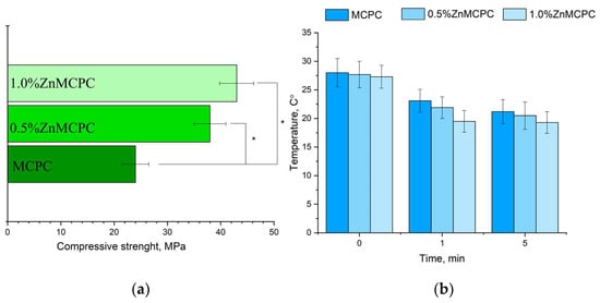 Results on the cement materials after mechanical testing for compressive strength (a); temperature measure during the setting process of cement materials (b). * Indicates significant differences compared between the Zn-doped samples and the control pure MCPC composition at p < 0.05 levels.