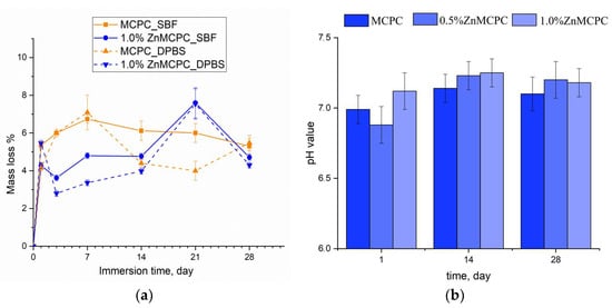 Degradation kinetics are determined by weight loss and pH value, and the profile is plotted as a function of time. The solubility assay of the cement materials revealed that on the first day of the experiment, the mass loss of the samples did not exceed 6%, regardless of the type of mortar. At the initial stage of the dissolution process, the unreacted cement liquid was removed, and subsequent features of the behavior of the cement materials in the model liquids were suggestive of processes taking place on the surface of the material, where interactions proceeded between the dissolved Ca2+, Mg2+, Na+, OH−, HPO42−, and PO43− ions. The greatest mass loss in the MCPC sample was 7% and happened on the 7th day of the experiment in the model liquids; on the 14th day, the solubility in DPBS was less than the SBF; however, by the 28th day, the mass loss reached 5%. The introduction of zinc into the MCPC affected the nature of the solubility of the samples, and mass losses in the model liquids diminished; however, by the 21st day, the loss reached 7%, and by the end of the experiment, the solubility of the samples declined.