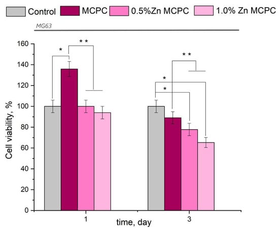 Viability of MG-63 cells during the cultivation on the bone cement samples or control samples (polystyrene). Data represent means ± SD (n = 2). * Indicates a significant difference compared to the control group at p < 0.05 levels. ** Denotes a statistically significant difference comparison among the groups (p < 0.05).