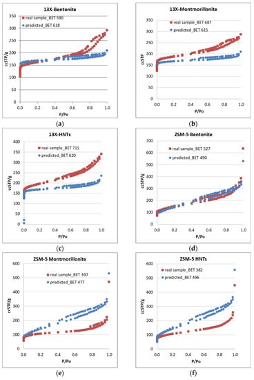 Comparison between the real and predicted N2 adsorption–desorption isotherms (77Κ) of the biocarriers examined in this work: (a–c) 13X with bentonite, montmorillonite, and HNTs; (e–f) ZSM-5 with bentonite, montmorillonite, and HNTs.