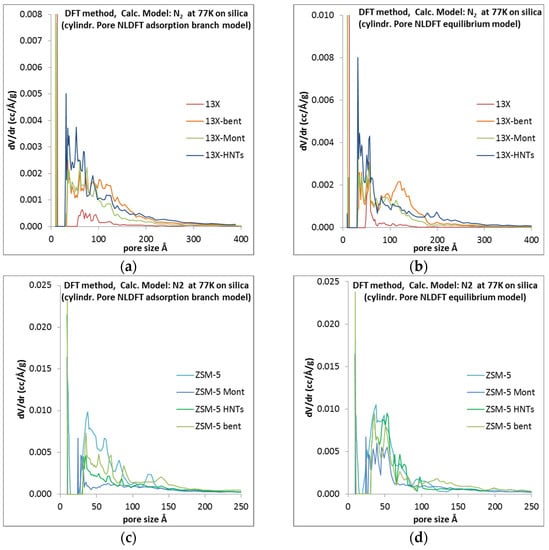 NLDFT-derived PSD of 13X, ZSM-5, and the respective biocarriers: (a) 13X and biocarriers adsorption branch; (b) 13X and biocarriers desorption branch; (c) ZSM-5 and biocarriers adsorption branch; (d) ZSM-5 and biocarriers desorption branch.