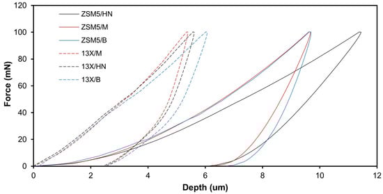The results obtained from the nanoindentation test data are plotted in Figure 4. The graph shows the relationship between the applied force and the resulting displacement during the indentation test. During the loading curve, a probe is pushed into the surface of the material with continuously increasing force, while the displacement of the probe is recorded, so it is possible to calculate the material’s hardness. Once the maximum force is reached, the probe is then retracted from the material, and the unloading curve is recorded. The unloading curve shows the relationship between the applied force and the displacement as the probe is withdrawn from the material. The material’s modulus of elasticity can be calculated from the slope. The results show that both the hardness and the modulus of elasticity of the biocarriers made of 13X are higher than those of the biocarriers made of ZSM-5. Regarding the effect of the binder on the modulus of elasticity and hardness, there is no clear trend.
