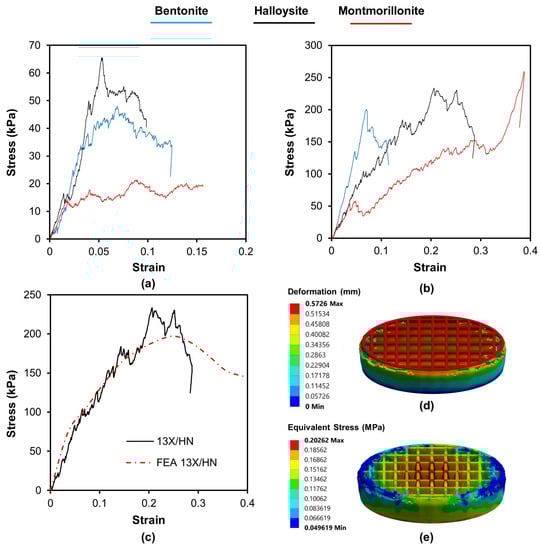 Compression results for (a) ZSM-5 zeolite combined with different binders and (b) 13X zeolite combined with different binders and (c) FEA-generated compression test results compared to experimental values of 13X specimens along with (d) vertical deformation and (e) stress distribution of the structure under compression load, utilizing the 13X/HΝTs material properties in the FE model.