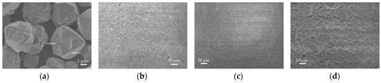 SEM images of (a) pristine 13X particles, (b) 13X/bentonite, (c) 13X/halloysite nanotubes, and (d) 13X/montmorillonite 3D-printed biocarriers.