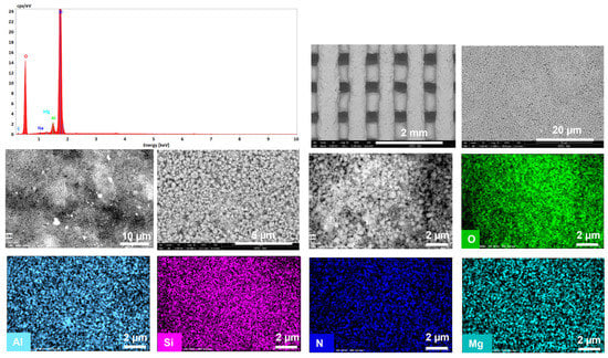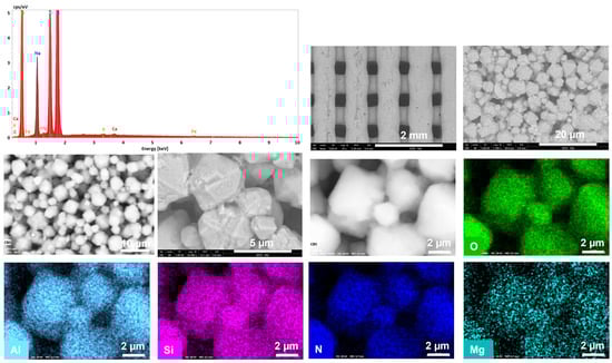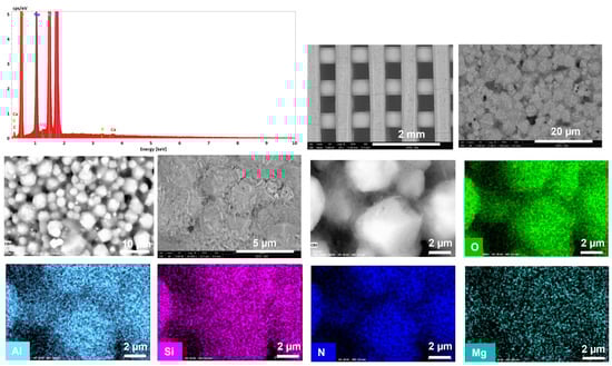 Energy spectrum (top left), SEM images (black and white), and EDX (color) mappings showing macrostructure, microstructure, and composition of the 3D-printed biocarriers, including uniform dispersion of the montmorillonite fillers in the 13X matrix.