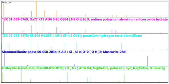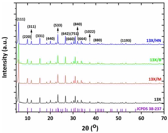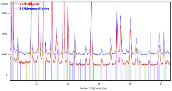 The XRD spectra of zeolite 13X with all three combinations of inorganic materials (bentonite, halloysite nanotubes, and montmorillonite) show the characteristic peaks of zeolite 13X, which overlap the peaks of the inorganic binders (Figure 11). This is due to the large amount of zeolite 13X in relation to the corresponding inorganic materials, as the percentage of bentonite, halloysite nanotubes, or montmorillonite in the final biocarrier is 11%. This percentage is calculated from the quantities of raw materials used to prepare the mixture. Notwithstanding, the obtained XRD diffraction patterns with the illustrated corresponding planes are consistent with the literature data on typical 13X zeolite structures [31,32,33]. Characteristic peaks are assigned to cubic sodium aluminum silicate hydrate phases (Fd3m space group) [32]. See Figure 12 for more details of the main 13X phase present and other reflections identified in the selected best performing 3D-printed 13X/halloysite nanotubes and 13X/montmorillonite samples.