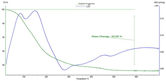 TGA-DTG curves recorded in air as a function of temperature from RT to 700 °C: TGA mass loss curve (green) for 3D-printed 13X/halloysite nanotubes (a weight loss of 22% is associated firstly with the loss of water at up to 200 °C and then methylcellulose loss at 550 °C).