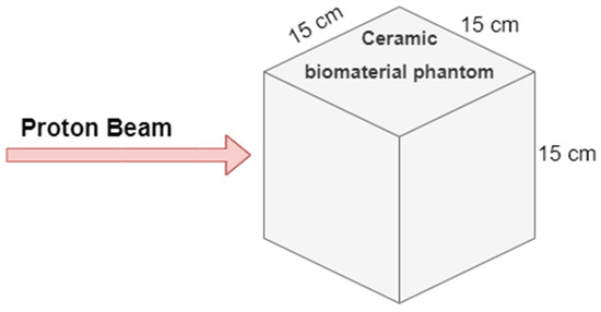 In the MC TRIM system, the figure shows the shape and size of the phantom formed from the ceramic biomaterial and the direction of progression of the proton beam.
