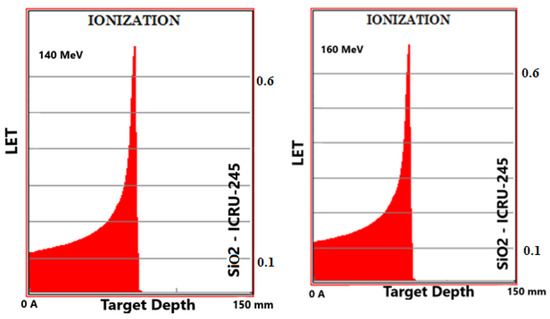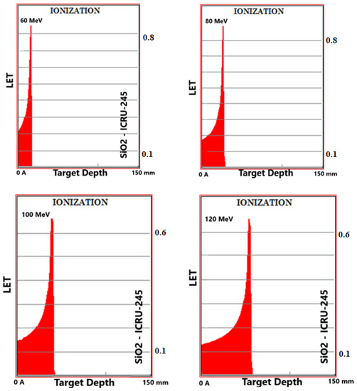 MC TRIM simulation output figures of ionization (LET (ev/A)) values in SiO2 ceramic biomaterial of a 106-particle proton beam with 60–160 MeV energy.