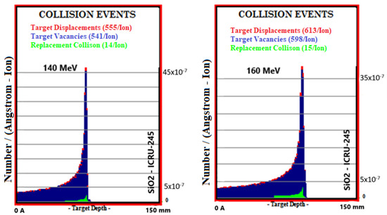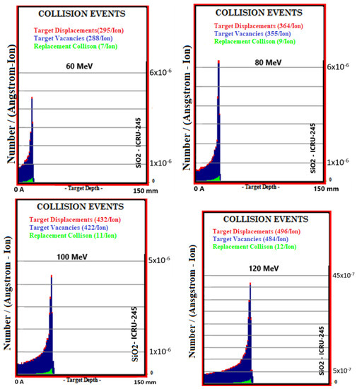 MC TRIM simulation output figures of recoils values in SiO2 ceramic biomaterial of a 106-particle proton beam with 60–160 MeV energy.