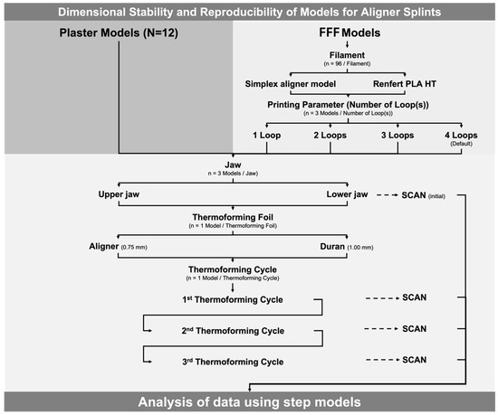 For this reason, the aim of the present investigation is to analyze the impact of different FFF filaments, varying printing parameters (number of loops), different thermoforming foils, repeated thermoforming cycles, and type of jaw on the dimensional stability of FFF models for aligners and to compare their dimensional stability with that of conventional plaster models after repeated thermoforming cycles. The first hypothesis tested was that none of the parameters mentioned above would show an impact on the dimensional stability of FFF models and, further, that there would be no differences in dimensional stability when compared to conventional plaster models. In addition, the initial sets of FFF models fabricated using two different filaments (default, four loops) were compared with those of conventional plaster models. The corresponding hypothesis was that there would be no differences in precision between the different models tested.