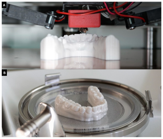 Three-dimensional printing, also known as additive manufacturing or rapid prototyping, has been applied in dentistry for more than 20 years [9]. Its application ranges from prosthodontics, oral and maxillofacial surgery, and oral implantology to orthodontics, endodontics, and periodontology. The main application of dental 3D printing is in models that are largely produced using stereolithography (SLA) or digital light processing (DLP) technologies [9,10]. Both technologies are based on light-curing polymers that are layered to a 3D object using a light source. Alternatively, models can also be additively manufactured using a fused filament fabrication (FFF). This process is based on a thermoplastic polymer filament that is extruded and built up layer-by-layer to form a 3D object. The FFF process is characterized by lower acquisition costs as well as lower costs for consumables. However, for a long time, the process was considered too inaccurate to produce dental precision models [9].