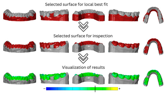 For this, the initial situation (pre-scan) was first imported as a mesh. If present, mesh errors were corrected, and subsequently, the mesh was converted into CAD as a reference model. Then, the dataset of the model after the first thermoforming cycle was imported as a mesh, and again, mesh errors were corrected if present. Then, the two imported datasets of the models were aligned in two steps. First, the automatic pre-alignment was applied, in which the mesh was pre-aligned to the CAD. The searching time was set to “normal” in the settings. In the next step, the main alignment was performed using the local best-fit method. For this purpose, the model base and the gingival areas were selected as the alignment area, and the initial situation (CAD) was defined as the target element (maximum distance was set to 1 mm). The teeth were defined as the inspection area. For the inspection, the area previously defined for alignment was restored under “local best fit” and was inverted so that the area of interest for the analysis of dimensional stability was selected. To analyze deviations between CAD and mesh, an area comparison was applied to the mesh (maximum distance was set to 10 mm). Selected surfaces that were used for local best fit and surface inspection, as well as visualization of results, are shown to be exemplary for the mandibular model in Figure 3. To visualize deviations, the minimum and maximum were displayed in color and localized using deviation flags. Unrealistically high or low deviation flags or extreme changes in the color gradient suggested errors in the mesh. If this was the case, the mesh errors were corrected via repairing, smoothing, or refining. Then, the step model was generated by importing the dataset of the model after the second thermoforming cycle as a mesh to generate the “second step” in the analysis software. For this dataset, mesh errors were corrected if present. The alignment and selection of the inspection area was automatically set in the step model as equal to the “first step”. This procedure was repeated for another dataset of the model, namely after the third thermoforming cycle as the “third step”. In every single step, the deviations of each model after thermoforming (mesh) from the initial model (CAD) were analyzed. Finally, the maximum negative deviations per analysis step were exported for each test group and transferred to a coded Excel sheet.