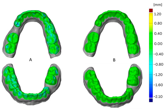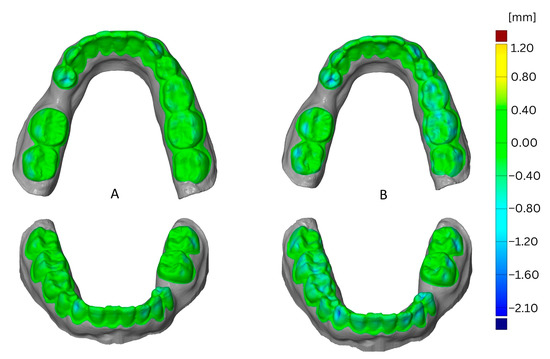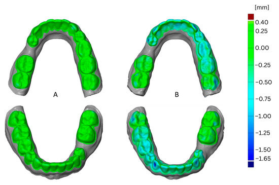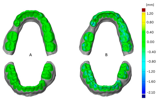 The impact of the jaw is shown in Figure 8 as a comparison of models of mandibula versus maxilla. This example shows the effect of using aligner foil for thermoforming, the Simplex filament, and four loops for printing. The greatest deformation was found in the maxillary model and was located on incisor edges.
