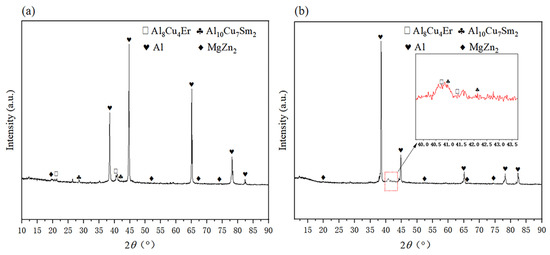 Figure 5 shows the XRD pattern of sample #2 before and after heat treatment. After the addition of rare earth elements Sm + Er, a new Al-RE(-Cu) phase appeared, namely rare earth phases Al10Cu7Sm2 (PDF 36-1267) and Al8Cu4Er (PDF 33-0006). The diffraction peak of Al8Cu4Er appeared near 20°, that for Al10Cu7Sm2 near 30° and for both phases around 41°.