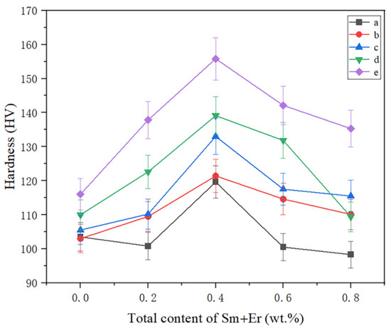 - With the increase in the total amount of Sm + Er, the alloy grain size decreased and then increased. When the total amount reached 0.4 wt.% (0.3 wt.% Sm and 0.1 wt.% Er), the minimum grain size was refined to 53 μm, which had an obvious refinement effect.