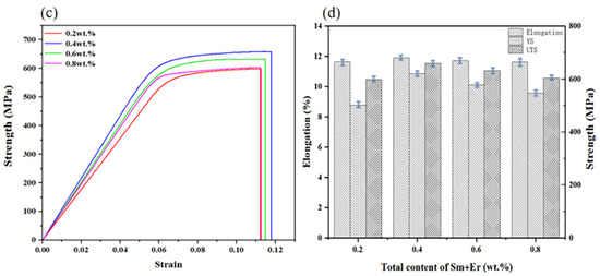 There was a positive relationship between hardness and tensile strength of materials. In this study, various as-cast alloys treated with 410 °C × 2 h solid solution treatment + 150 °C × 12 h aging treatment were selected for comparison of tensile mechanical properties before and after heat treatment. Figure 9 shows the tensile properties of different total contents of Sm + Er before and after heat treatment. It was obvious that the mechanical properties of 7055 aluminum alloy before and after heat treatment were generally improved. The tensile strength, yield strength and elongation were respectively increased by 13.5%, 11.9% and 37.0%. The 7055 aluminum alloy with a total content of 0.4 wt.% Sm + Er reached the maximum tensile strength and yield strength, 658.1 MPa and 620.5 MPa, respectively, and the maximum elongation reached 11.90%. Compared with the original as-cast aluminum alloy, the tensile strength increased by 27.0%, the yield strength increased by 31.9% and the elongation increased by 30.8%. However, with the increase in the content, the alloy strength began to decline and the strengthening effect was significantly weakened. For example, the tensile strength, yield strength and elongation of 7055 aluminum alloy with a total content of 0.8 wt.% Sm + Er before heat treatment decreased by 2.0%, 0.2% and 8.9%, respectively, compared with 7055 aluminum alloy without rare earth elements.