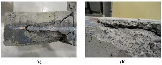 Debonding was the primary failure mode in all elements under test. The CFRP strip detached with a portion of the concrete cover. The failure was rapid, regardless of whether the adhesive curing process was accelerated or proceeded according to the product information sheet []. In the elements of series 2, 3 and 4, the carbon fibre strip detached together with the concrete cover in the shear zone, and the detachment length almost reached the point of load application. In addition, in series 2 the strip slid out of the copper flat bar clip acting as a conductor (see Figure 5b). The strips in series 5 elements debonded at a greater distance from the shear zone, in a small section closer to the centre of the span. The concrete cover separated from the strip. As demonstrated, the accelerated adhesive bonding process did not result in a different failure mode than bonding under normal temperature conditions. It was observed that the debonding length decreased with the increasing strip heating temperature. The smallest length was observed in the case of the element strengthened with the adhesive cure time of seven days. Failure of the RC element is shown in Figure 5.