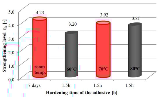 It was found that the accelerated adhesive curing time obtained by heating provides the strengthening level similar to that of the procedure without heating. The strengthening level ranged from 3.20 to 3.92. The highest value of the heated elements was observed at a temperature of 70 °C. This was the closest value to that of the strengthening level (ηu = 4.23) in the procedure without accelerating the cure time (see Figure 6). Compared to the highest strengthening effect of ηu = 3.92, the levels at strip heating temperatures of 80 °C and 60 °C were lower by 2.8% and 18.4%, respectively.