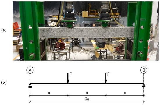 The RC elements were tested in a three-point bending scheme. Due to the capabilities of the test stand, the span of the element in the axes of the supports was equal to leff = 500 mm. The elements were subjected to a monotonic load with the concentrated force F increasing at a rate of 0.4 kN/min until the specimen failed. The concentrated force was applied at half the distance from the axis of both supports, i.e., at ½ the span (leff.) A view of the test stand is shown in Figure 4.