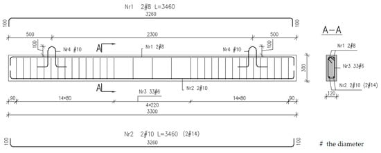 In all tested beams with dimensions of 120 × 300 × 3300 mm, ribbed steel bars of A-IIIN grade BST500S were used for longitudinal reinforcement. The elements were divided into two main series I and II, differing in the steel reinforcement ratio. In both series, two 8 mm diameter bars were used in the compression zone. In the tension zone, two 10 mm bars (series I) and two 14 mm bars (series II) were used. The stirrups were made of the same class and grade of steel, with a diameter of 6 mm, spaced at 100 mm (shear section) and 225 mm (pure bending section)—see Figure 8.