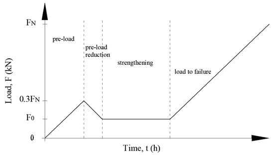 To simulate the strengthening of RC elements under real conditions, preloaded elements were strengthened on the underside. The load was maintained throughout the adhesive cure time. The assumed preloading corresponded to the actual loads on the RC floor beam. It was thus assumed that the value of the preloading force would increase to 30% of the unreinforced beam load capacity and reach 8 kN and 13 kN for beams with lower and higher steel reinforcement ratios, respectively. Accordingly, the preloading was reduced to 3.9 kN for 2#10 and 6.6 kN for RC beams 2#14—and maintained at the same level throughout the strengthening procedure. The load was maintained both in the accelerated strengthening method (1.5 h) and the conventional method (7 days). The elements were loaded and unloaded at the concentrated force F increase rate of 0.4 kN/min. After the entire strengthening process was completed, the reinforced concrete beams were loaded monotonically to failure. A graphical representation of the loading program is shown in Figure 9.