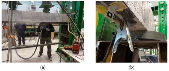 The strengthening procedure started with the substrate preparation for installing a CFRP strip. The groove in the concrete cover was cut out on the test stand, from the bottom up of the components under the load described above (see Figure 10a). The grooves were made using a diamond blade concrete saw. Their dimensions were taken in accordance with the requirements of the strip and adhesive manufacturer [] and were 7 × 14 mm and 7 × 24 mm for the Sika®CarboDur® S NSM 1.030 and Sika®CarboDur® S NSM 2.025 systems, respectively. The groove was made at a distance of 60 mm from the side edge of the tested element. Its length was determined by the “capability” of the concrete saw, i.e., its ability to reach the steel support as far as possible. Before bonding, the groove was thoroughly cleaned of concrete residue and dust using compressed air. The CFRP strip was then cut to the appropriate length and bonded into the concrete cover using the adhesive of the system. As the length of the strip depended on the groove length, the lengths of the Sika®CarboDur® S NSM 1.030 and Sika®CarboDur® S NSM 2.025 strips were 2360 mm and 2260 mm, respectively. The cleaned groove was then filled with the adhesive and the strip was inserted. The beam was left under a constant load (3.9 kN and 6.6 kN for RC beams 2#10 and 2#14, respectively) for 7 days under laboratory conditions at 23 °C. The beams with the adhesive subjected to accelerated curing (1.5 h) at a heating temperature of t = 70 °C had the ends of the strip smeared with copper paste before bonding. Copper flat bar clips were clamped on the strip ends, extending beyond the tested element (see Figure 10b) to allow the current to flow between the conducting wires of the heating device and the carbon fibre strip. The so-prepared strip was subjected to heating using the prototype heating device (see Figure 2).
