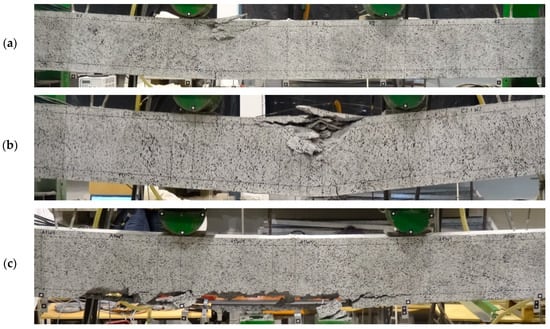 Failure due to composite debonding was observed in four strengthened beams, among which two failure modes were further distinguished: type A and B. Type A was characterized by the fact that within the connection between the strip and the copper flat bar (necessary for power supply) the concrete cover remained well bonded to the strip, and the composite (in this part) did not debond from the reinforced concrete beam under test—beams A1W1, A2W1 (see Figure 11c). The second type of failure mechanism—type B—was characterized by a plane of debonding running along the steel reinforcement, which covered the area and the connection between the strip and the copper flat bar. The flat bar strip and concrete cover debonded from the tested element, resulting in a characteristic “scramble”—A1W2, C1W2 beam (see Figure 11d). Another failure mode of the strengthened beams was exhausting the load-bearing capacity in the compression zone of the concrete—A2W2, C2W1, C2.1W2 beams (see Figure 11b). The test of the C1.1W1 beam was automatically stopped by the program controlling the actuators once the displacement limit set at 70mm was reached.