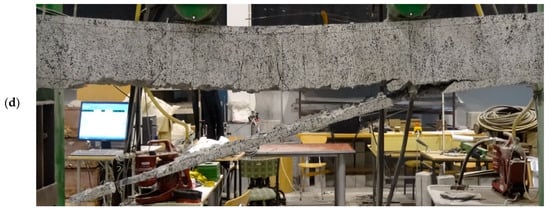 Non-strengthened beams (R1 and R2) failed in a manner typical for flexural RC elements by exhausting the load-bearing capacity of the steel and concrete in the compression zone (see Figure 11a). The crushing of the concrete took place in the zone of an almost constant bending moment, near the loading force, located on the side of the hinged-sliding support. Two failure mechanisms were observed in the strengthened beams—debonding of the composite strengthening system along with the concrete cover (see Figure 11c,d) and concrete crushing in the compression zone of the section (see Figure 11b).