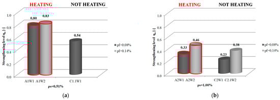 Graphical representation of the strengthening level of RC beams: (a) Beams with low steel reinforcement ratios; (b) Beams with high steel reinforcement ratios– red colour indicates the beams strengthened with heating of composite strip.