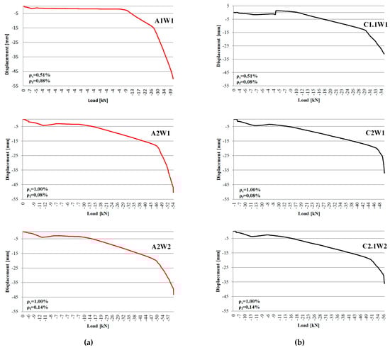 A graphical representation of the strengthening level of beams wit steel reinforcement ratios of ρs = 0.51% and ρs = 1.00% and two CFRP reinforcement ratios ρf = 0.08% and ρf = 0.14% for monotonic force increments until element failure is shown in Figure 13. The figure also illustrates the difference in the strengthening ratio of beams strengthened using accelerated curing (A-series beams) and strengthened without heating the strip (C-series beams). The C1W2 beam was the only one of the 10 beams tested that failed to show the overall trend observed in the comparison of elements in the “hot” and “cold” methods and steel and composite reinforcement ratios. For this reason, it was disregarded from further analysis.