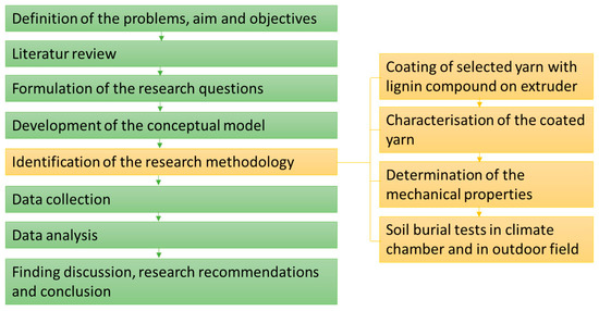 To achieve the aforementioned objectives and to fill the identified research gap, a comprehensive research methodology comprising the phases in Figure 1 was adopted. After a thorough literature review on the degradation of natural fibers, biodegradable protective coatings for natural fibers, and lignin coatings for textiles, the research questions were formulated: “Which lignin and which reference yarn material should be used? How or with which equipment should the lignin be applied? Does the application thickness play an important role and which one? How should the degradation behavior be tested? Which property characteristics are most important, which pre- and post-tests have to be carried out? How should the results be evaluated?”. The working concept was then drawn up, and the methods were defined, both of which are explained in more detail in the following Section 2.2. Data collection was carried out concurrently, starting from the coating, the burial tests, and the optical and mechanical tests before and after burial. Collected data were analyzed with respect to, among other things, the maximum tensile strength loss. Two different burial methods, climate chamber and outdoor field, were compared. Thus, the outdoor tests were validated, and the time acceleration factor in the climatic chamber tests was calculated.