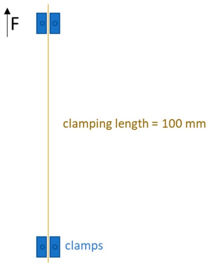 The mechanical properties of the uncoated and coated yarns are measured according to ISO 2062:2009 (Determination of single-end breaking force and elongation at break using constant rate of extension (CRE) tester) [30] as well as the titers according to DIN 53830-3:1981-05 (Testing of textiles; determination of linear density of single and plied yarns; simple yarns and plied yarns, textured yarns, short length method) [31] with the test device Zwick 1455, ZMART PRO (Zwick Roell, Ulm, Germany). Yarns are fixed between two ZZW Nr.22 (Vulkollan clamps) clamps (Figure 2). Tests were performed using a clamping length at start position of 100.00 mm, a measuring head of 100 N, and a preload of 0.5 cN/tex. The testing speed was 100 mm/min. At least 15 tests were performed for each sample.