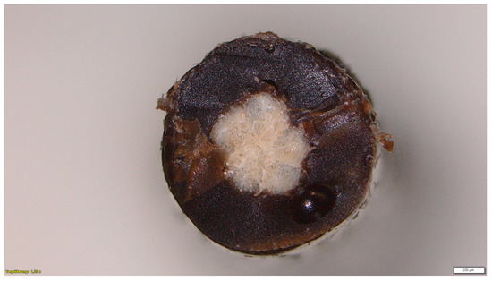 Microscopic image of yarn cross-section of coated sample 1 (magnification ×1.25; diameter of coated yarn approx. 946 µm).