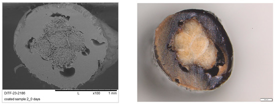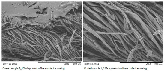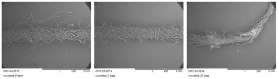 The coated yarns, on the other hand, hardly showed any visual damage up to the end of the test period of 158 days. Even at the end of the entire burial period of 158 days in the outdoor test field, the coating was still intact—even with the thinnest coating. This is also confirmed by the SEM images of the coated sample 1, which were taken at different burial periods ranging from 0 to 158 days (Table 5).