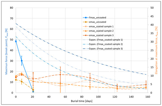 The uncoated yarn was completely degraded after 20 days, while the thinly coated yarn (coated sample 1) still had a maximum tensile strength of approx. 8 N after 158 days; moreover, the maximum tensile strength of the thickly coated yarn (coated sample 3) was approx. 20 N, with a maximum tensile elongation of 5% (Figure 9). The ultimate tensile strength also decreased for the coated yarns; however, the degradation rate reduced over time.