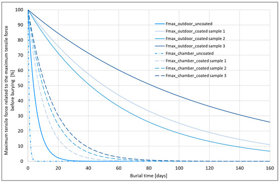 b. Residual strength: To calculate the residual strength, the maximum tensile forces of the coated samples were determined after the burial time f1 and set in relation to the respective maximum tensile force of the unburied sample:
