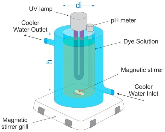 The photocatalytic activities of Zini, ZL55015, ZL55030, ZL55060, and ZL550240 were evaluated using the photo-Fenton process in a Pyrex glass reactor. This reactor, with a volume of 500 mL, a diameter (di) of 70.7 mm, and a depth (h) of 155 mm, was stirred at a rate of 700 rpm. Each experiment utilized a reaction mixture comprising 20 mg of the specified zeolite and 28 mg of FeCl3 dispersed in a 350 mL solution with a concentration of 150 ppm of LY4G dye. This resulted in a water layer with a thickness of approximately 89 mm. Then the pH of the solution was adjusted to 2.5 (using the proper HCl solution), and 4 mL of hydrogen peroxide was then added. The work pressure was atmospheric pressure (585 mm Hg). Experimental tests were conducted using an average UV-A light intensity of 360 W/m2 (Figure S1). The UV-A lamp was submerged in the solution, and the exterior of the reactor was covered with aluminum foil to prevent light leakage. The reactor also incorporates a water-cooling jacket to dissipate heat generated by the lamp, while keeping the temperature steady. The cooling water temperature was set to 24 °C with a flow of 13 L/min for all tests. Figure 2 illustrates the reactor assembly used in the photocatalytic tests.