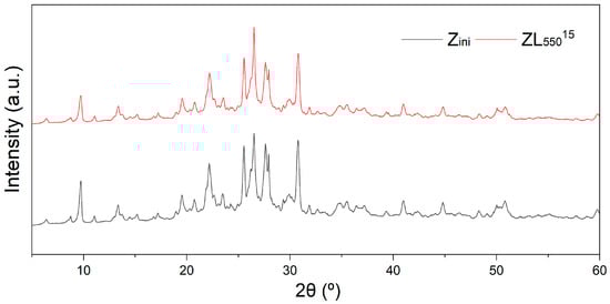 The samples exposed to different calcination temperatures demonstrate significant variations in surface area, pore volume, and average pore radius. Among these temperatures, calcination at 550 °C proves to be the most effective method in enhancing the surface and pore volume areas (BET and BJH) of the ZL samples. In contrast, the calcination process carried out at 300 °C and 700 °C leads to a decrease in surface area in contrast to the original Zini sample. Interestingly, the pore radius values exhibit a general decline as the calcination temperature increases, with the smallest pore radius corresponding to the ZL55015 sample. It has been observed that an increase in surface area often correlates with an enhancement in pore volume and a reduction in pore radius. This correlation could potentially lead to the formation of bottleneck-shaped pores, signifying a noteworthy morphological transformation in the material [58]. A comprehensive literature review reveals a lack of studies specifically addressing the relationship between pore size and its impact on adsorption capacity and photocatalytic activity in natural zeolites. Nonetheless, the physical state of occluded molecules in zeolites depends on the size and structure of the pores in the host material [59,60]. Based on prior studies, it has been established that calcination treatment is the most effective method for modifying the properties of natural zeolite. According to the literature data, a temperature of 550 °C is defined as the optimal temperature for annealing natural zeolites [30,45,61]. Considering these findings, the XRD characteristics of Zini and ZL55015 samples are further explored.