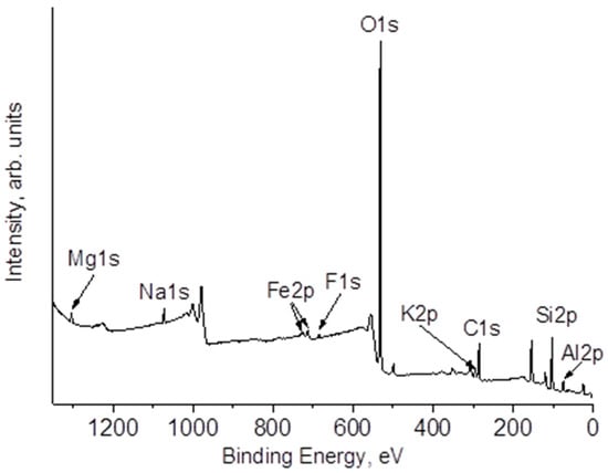 The study of the surface composition of natural zeolite and the impact of annealing on its near-surface layer composition was further pursued using the XPS method. An overview spectrum of the original sample is shown in Figure 5. Upon close examination of the sample under study, it has been determined that the surface contains not only the elements previously detected through the EDS method, but also traces of fluorine and nitrogen. According to the data presented in Table 4 referring to the composition of the samples under study, it is evident that the use of laser radiation treatment results in a diminution in the concentration of oxygen in the near-surface region. This decrease can be attributed to the partial restoration of the surface. Together with a decrease in oxygen concentration, an increase in carbon concentration occurs. In some cases, excessive carburization can lead to gasification of the support, which can further impact the activity of catalyst. Therefore, controlling the carburization conditions is crucial for maintaining the desired catalyst activity in various reactions [62,63].