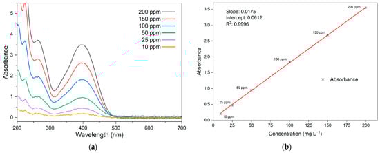 (a) Absorbance spectra of LY4G solutions at various concentrations and the corresponding (b) calibration curve at 400 nm.