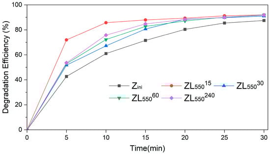 The results of the experiment, as shown in Figure 7, indicate that the ZL55015 sample, calcined for 15 s, demonstrated the most effective degradation efficiency over most reaction time intervals, while the original Zini sample exhibited the lowest efficiency in this regard. This can be attributed to the presence of Fe species detected in samples through EDS analysis. The Fe species are known to enhance the photocatalytic activity of zeolites. Thus, a higher presence of Fe species contributes to more degradation efficiency. In particular, the degradation efficiency of ZL55015 was at 71.9% within the first 5 min of the reaction, while the Zini sample was only at 42.7%. As the reaction progressed to 30 min, the degradation efficiency of ZL55015 peaked at 92%, while the Zini sample exhibited a degradation efficiency of 87.4%. These observations suggest that the calcination duration significantly affects the photocatalytic capabilities of the ZL samples, especially in the first minutes of the reaction.