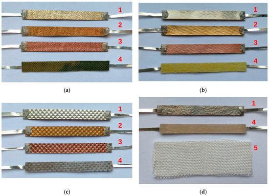 Views of samples (a) Cordura—sample A, (b) membrane—sample B, (c) non-woven—sample C, (d) composite—sample D, and (e) Cordura with PTFE—sample E, where 1—sample with Ag layer deposited, 2—sample with Au layer deposited, 3—sample with Cu layer deposited, 4—back side of the sample, and 5—bamboo fabric.