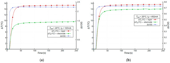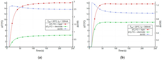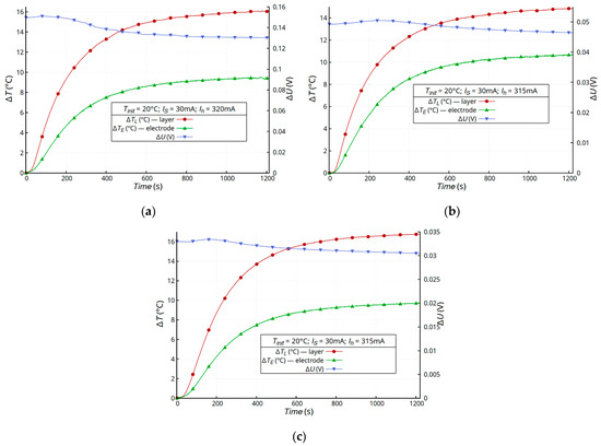 Figure 5 shows the time dependence of the temperature changes in the samples (ΔTL), electrodes (ΔTE), and drop voltage (ΔU) on the membrane samples (sample B). This composite consisted of a layer of compressed fibers bonded to a layer of Teflon (Figure 5d). The metallic layer was deposited directly onto the Teflon layer. Regardless of the metal layer, no unusual voltage changes were observed. The initial increase in the voltage on the sample (ΔU) was due to the increase in the temperature of the metallic layer, but, at a constant temperature, the voltage was also constant (Figure 5a–c).
