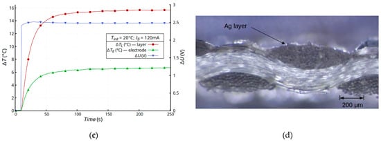 The type of metal deposited onto the surface of the textile did not qualitatively affect the observed phenomena. Regardless of the used substrate, the silver layers had the best electrical properties. For all the samples with a silver layer, the difference between the temperature of the layer and electrode was the smallest. This was due to the relationship between the resistances of the layer and the joint. The silver layer had the lowest resistance and, to obtain a temperature increase of 15 °C, it required the highest current value Is > 300 mA; for this reason, a higher joint temperature was observed.