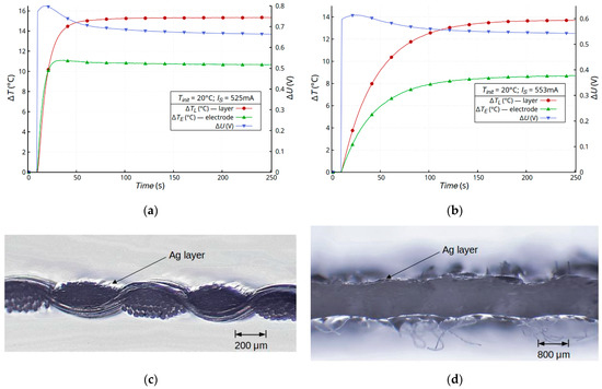 Time dependence of temperature changes ΔT and voltage drop ΔU on sample E (a) and sample D (b) samples with a silver layer and microscope images of the cross-section of a sample E (c) and samples D (d).