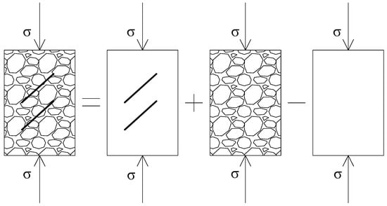 Macro-meso coupled damage is not the simple addition of microscopic damage and macroscopic damage; macroscopic damage and microscopic damage will influence each other during the loading process and cause some additional damage. Therefore, the study of macro-meso coupling damage should be based on the Lemaitre assumption, that is, the strain equivalence principle. The Lemaitre assumption was proposed by French scholar Roger Lemaitre in 1982. Since then, the Lemaitre assumption has been widely used in the fields of geotechnical engineering and material mechanics [,,]. Figure 1 illustrates a rock containing both macroscopic and microscopic defects, a rock containing only macroscopic defects, a rock containing only microscopic defects and a virtual rock without damage at all. Their moduli of elasticity are , ,  and , respectively, and their strains under stress  are , ,  and , respectively. Coupled damage theory can be described by the following equations:
