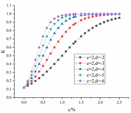 Figure 4 shows the influence of  on the evolution law of  when  = −3. As shown in Figure 4, with increasing , the growth rate of the curve remains unchanged, but the initial value of  decreases, indicating that the increase in  increases the variation range of the compaction stage. It is believed that  reflects the concentration of the pore distribution inside the rock mass.